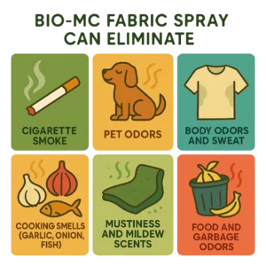 Bio-MC fabric spray doesn’t just mask unpleasant odors with fragrance—it permanently eliminates them at the molecular level. This is possible thanks to T-Sorb an innovative ingredient from Germany that uses zinc ricinoleate technology to capture and neutralize odor molecules through irreversible chemical binding.